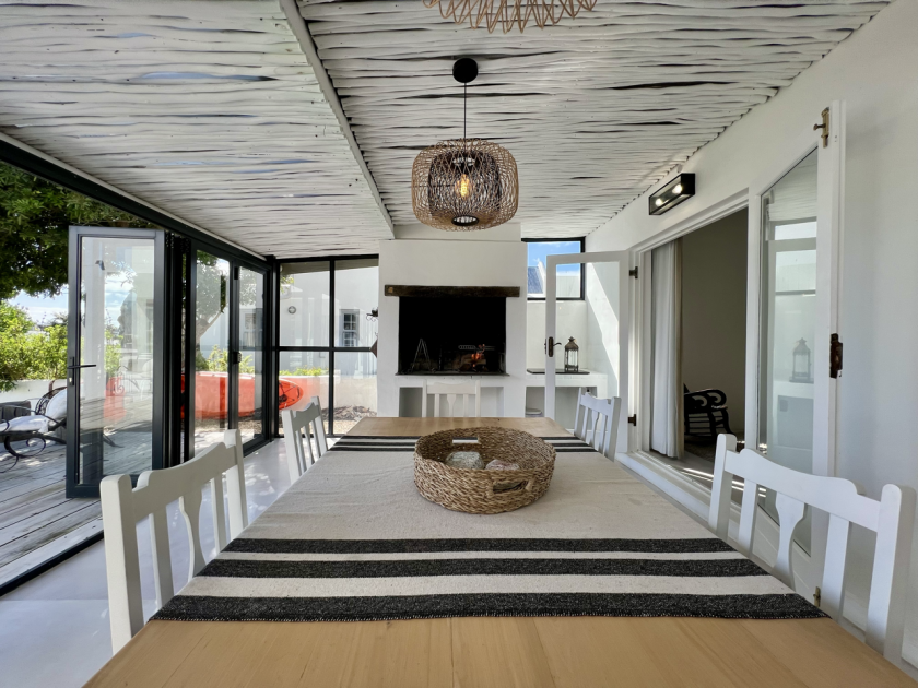 Enclosed stoep serving as dining room with fire place/braai. Dog bed under fire place/braai